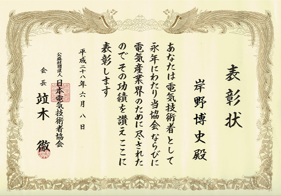 | 平成28年6月8日 | 日本電気技術者協会 表彰状 |