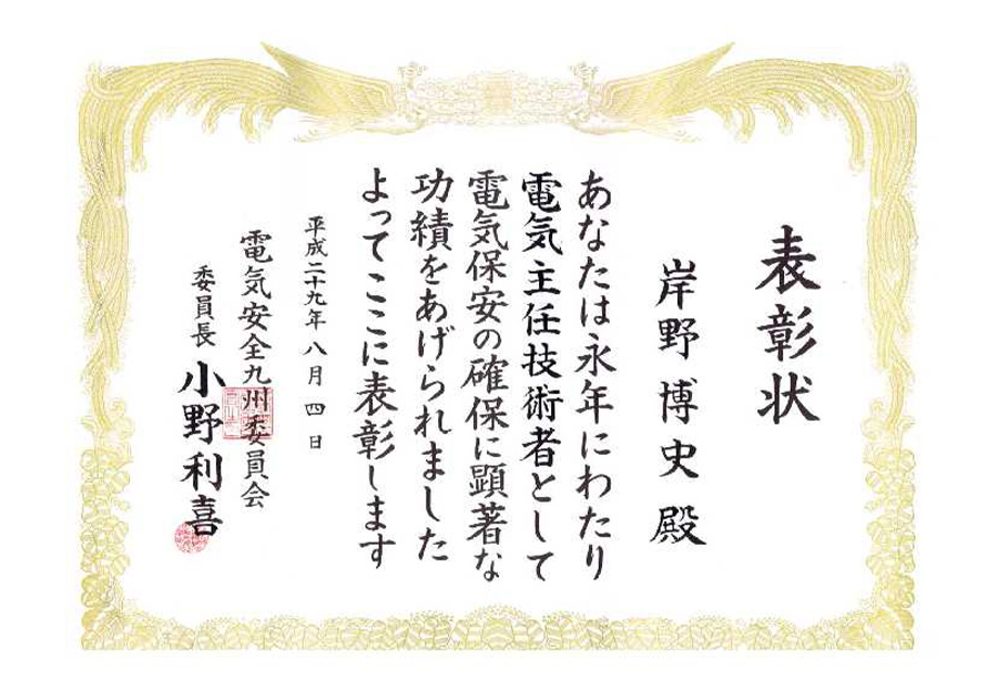 | 平成29年8月4日 | 電気安全九州委員会保安功労者 表彰状 |