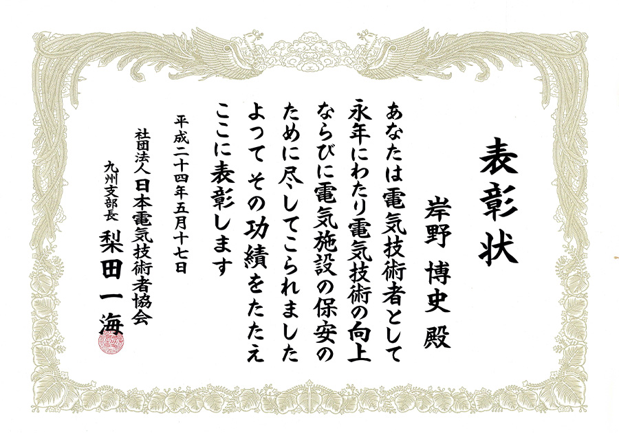 | 平成24年5月17日 | 日本電気技術者協会九州支部 表彰状 |