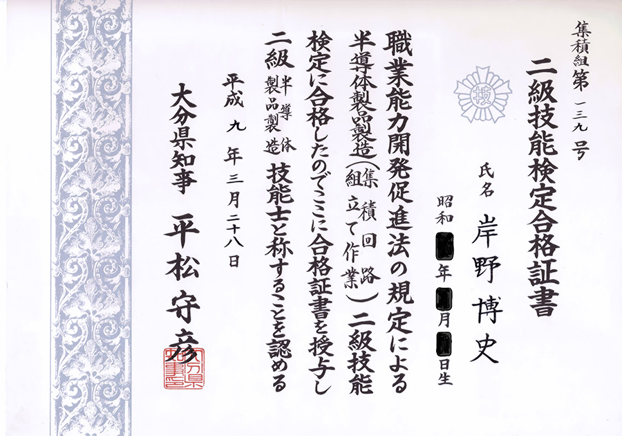 | 平成9年3月28日 | 二級技能検定合格証書 |
