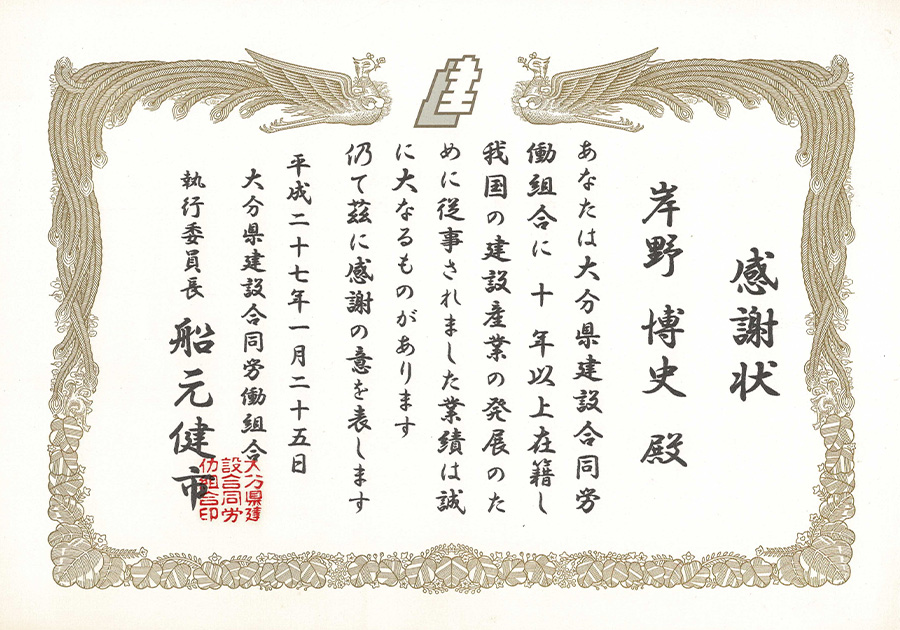 | 平成27年1月25日 | 大分県建設合同労働組合 感謝状 |
